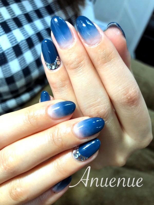 春色桜ネイルから一転、今期はネイビーに♡ アート2本、あとはグラデーションでシンプルに仕上げていただきました♪ いつもありがとうございます♡