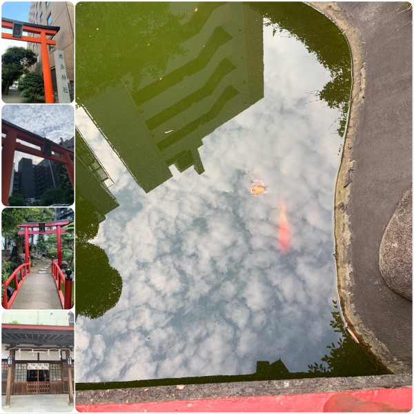 銭洗弁財天に渡る太鼓橋の池に鯉が泳いでたんだけど、写真を撮ったら空が反射して