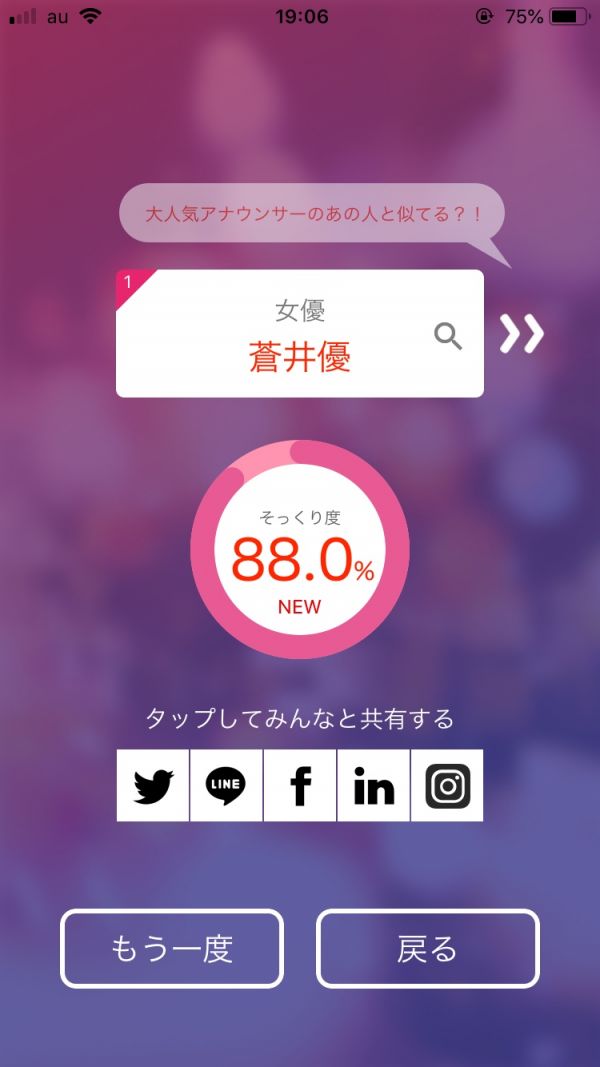最近話題の、そっくりさん診断というものをやってみました笑 そしたら、まさかまさかの女優の蒼井優さんが出てくるという恐怖🥶 どこも似てませーん笑 蒼井優さんに申し訳ないですわ、、😅💦 みなさんもそっくりさん診断やってみてください🙌 アプリであるので、 「そっくりさん」でチェック\_(・ω・`)✨ ちなみに2番目に似てる有名人は卓球の福原愛さんという診断でした、、、、 申し訳ございませんっ○| ̄|_ 今日も8時から💪 飲むぞ〜笑